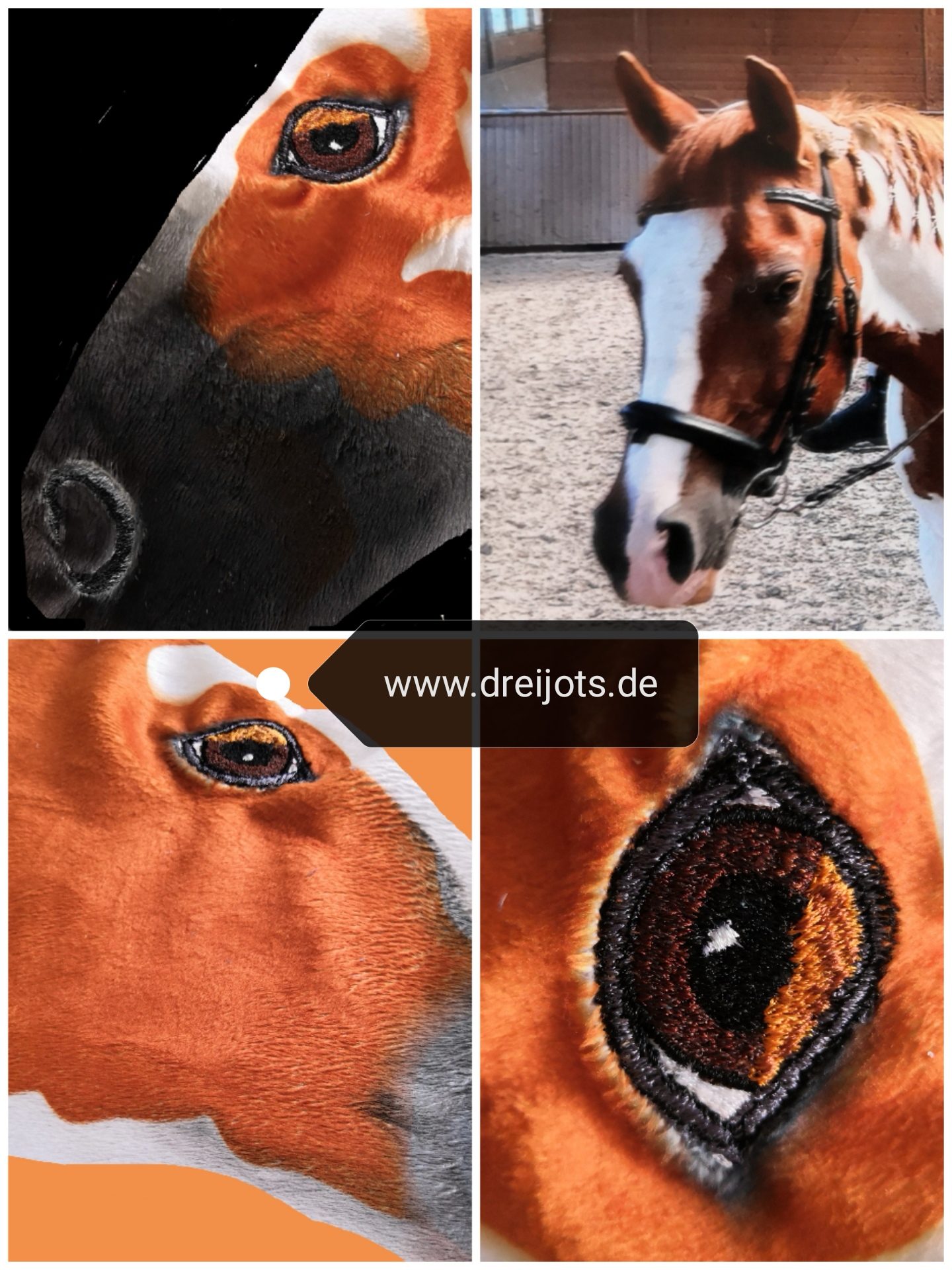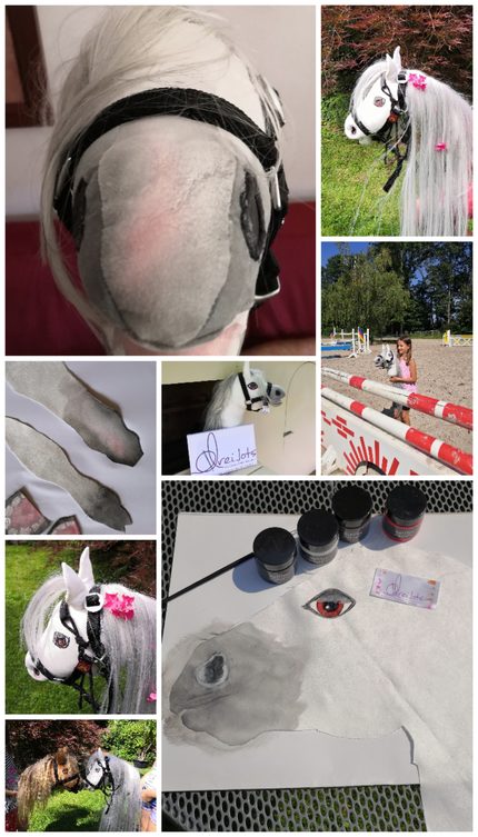 Die nachfolgenden Fotos stammen aus meinem Privatarchiv und zeigen meine handbemalten und bestickten dreiJots-Hobbyhorse-Sammlerstücke für Profi-Tunierteilnehmer*innen in Kooperation mit der großartigen Janette Bannermann, deren Schnittmuster und Stoffe ich für meine Einzelstücke verwenden darf. Mein kleiner Muster-Esel ist handbemalt und nach dem Schnittmuster „Holly“ der Firma Kullaloo gefertigt.